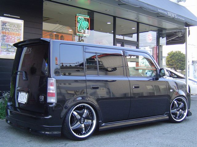 bBには珍しいドルチェの18インチにBOLD WORLDの車高調でローダウン☆エアサスで名高いメーカーさんの車高調なので落ちっぷりは格別ですね(^^)