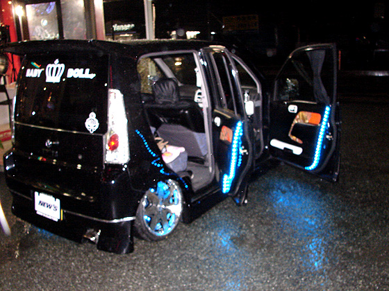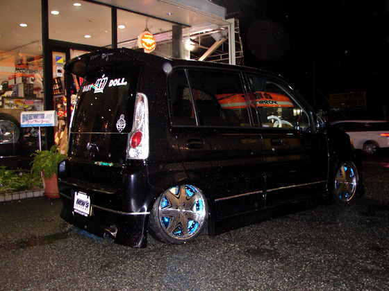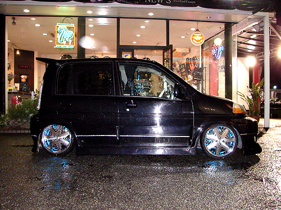 フルバンパーエアロにタイヤホイールは16インチマーベリック107Dを装着。足回りはBOLD レボリューションUエアサス+J−LINE リアアクスル☆激低仕様でイベントでのギャラリー視線を独り占め!!ナイトシーンにはマルチLEDカラーでホイール・ドアを光らせて目立っちゃっています!
