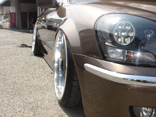 BOLDエアサスにトラフィックスターDTX20インチをインサート☆完璧な足廻りですねっ♪最新仕様はアーチ切り上げのオーバーフェンダー作成です(^^)同時にBMW M5純正色のセパンブロンズメタリックにオールペイント&ホイールを日産純正ブラックに艶々ペイントしました☆
