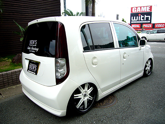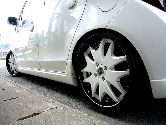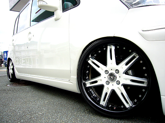 足元にはクラブリネアL566とL612を片履き! そしてボディ同色ペイント! フロントエアロはK-ブレイク。サイドとリアはモードパルファムでお気に入りをチョイス☆ ベンツのナンバー枠をワンオフ加工したりエアサスがついてたりなかなか手のこんだ1台です!!!