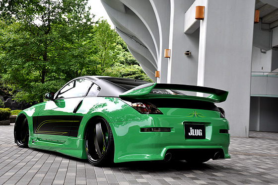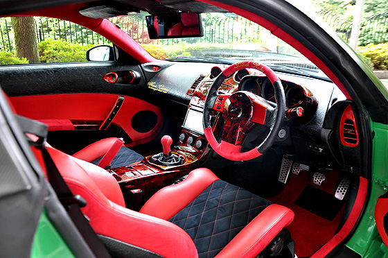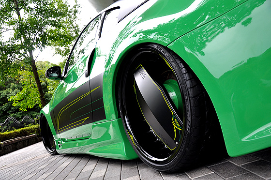 遂に完成ブログでも多々紹介されたスーパーZです、完成前に雑誌の取材も決まっているというパーフェクト具合です(笑)目を引くのはオリジナルブレンドのソ リッドグリーンにマットブラックでキメた全塗装ツートンカラーにMr.Gによるピンストライプ(インテリア・ホイル・ボディ)のコラボデザイン。ホイルは 独特のデザインをしている「STATUS」の20インチ、足回りは「イデアル」のマキシマムグレードのエアサスに電磁弁&リモコン式。ブレーキはキャリパー ペイントにニューズオリジナルドリルドローター。。。もちろんボディ同色&エアブラシロゴで完璧!他にもいろいろありますがこの辺で(笑) |