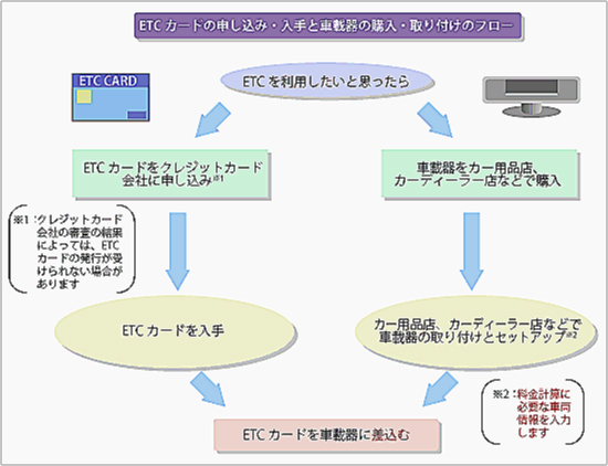 ETCカードとは、従来の通常高速道路入り口で券を受け取って、出るときに料金所の人に券を渡しお金を支払い…という大変時間のかかっていた高速道路の料金支払い体制を一新させた自動料金支払いシステムです。これにより、料金所の通過は3倍もスムーズになるといわれています。ETCは車に専用の機械を装備する必要があります。さらにETCカードと呼ばれる、 料金の支払いの際に使用するカードをセットしなれければいけません。
